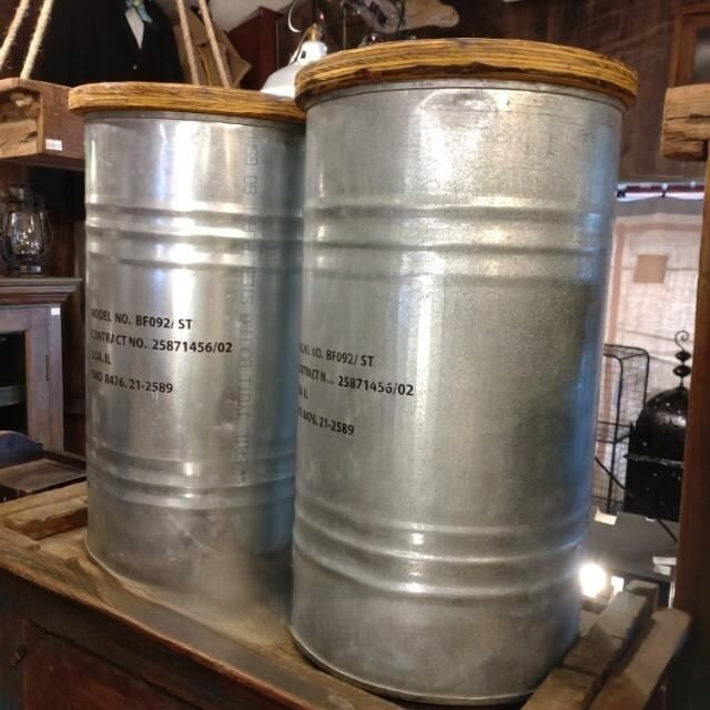 ステンシル風のプリントが施された古いドラム缶のようなボックス。